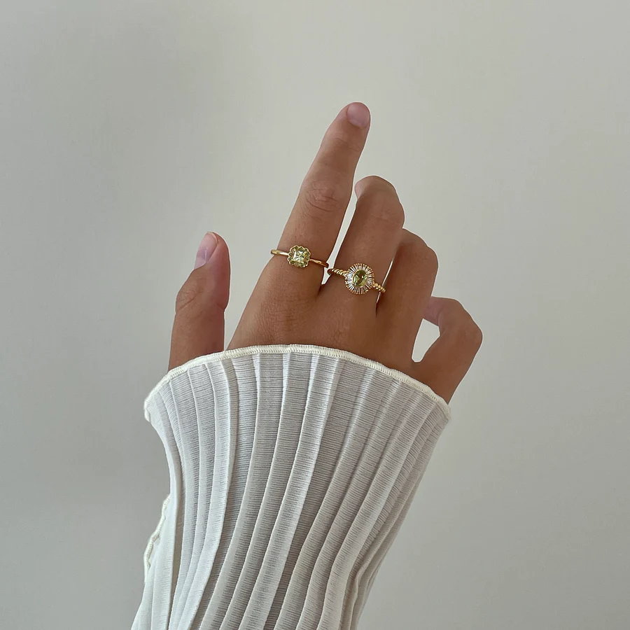 Deze ring heeft een vierkante groene steen en kleine groene steentjes aan elke kant. Deze ring maakt deel uit van een nieuwe familie. Combineer deze ring met de bijpassende armband, ketting en oorbellen voor een complete look! De ring is gemaakt van 925 sterling zilver. Elk 24Kae sieraad is met liefde en oog voor detail ontworpen door Kae Sutherland.