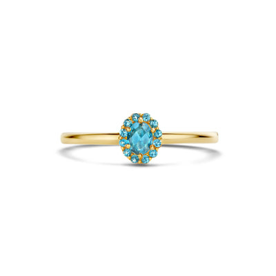 Deze ring van 14k geelgoud met blauwe topaas heeft de wauw-factor door de grotere steen in het midden die wordt omzoomd door kleinere exemplaren. De band van de ring heeft een doorsnede van 1,3 mm.