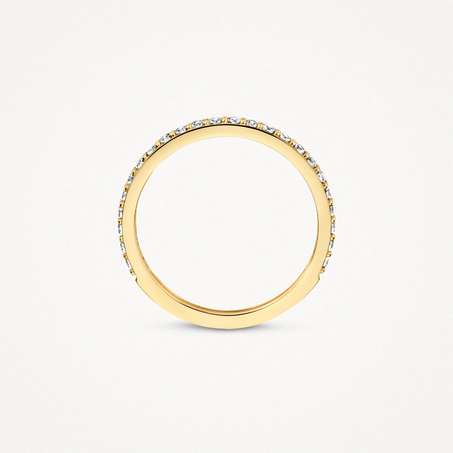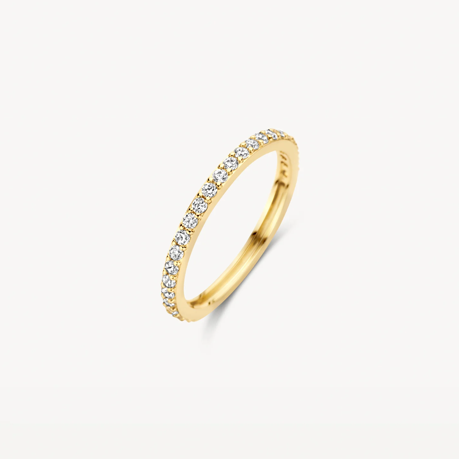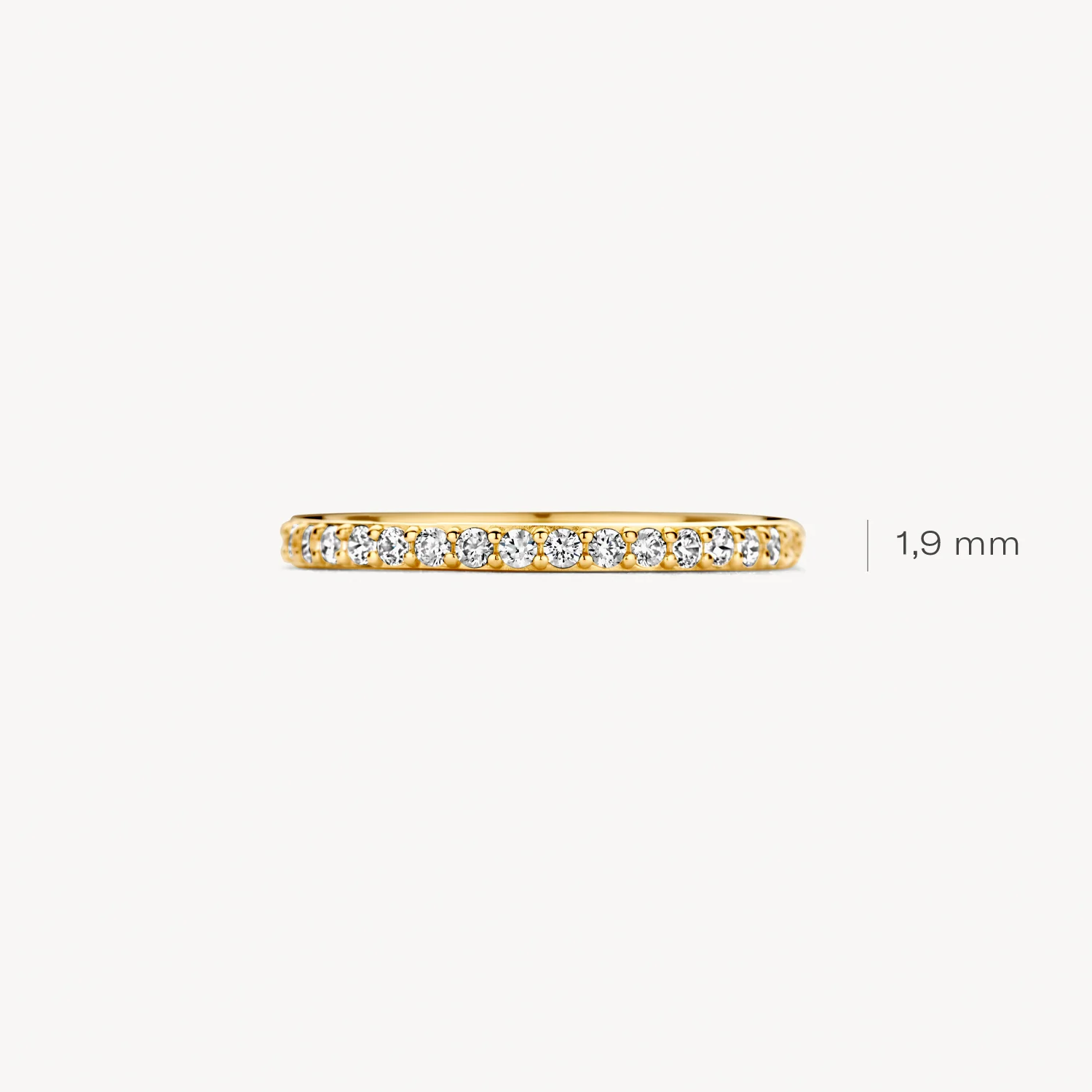 Betreed de wereld van elegantie met deze verfijnde 14k geelgouden ring, schitterend bezet met bijna rondom zirkonia's in een delicate pavé-zetting. Met een band doorsnede van 1,9 mm straalt deze ring een tijdloze klasse uit. Draag hem met trots op zichzelf, waarbij zijn pracht volledig tot zijn recht komt. Of combineer deze schitterende ring moeiteloos met onze oorringen 7306YZI uit de collectie voor een geraffineerde en harmonieuze look. Laat de subtiele luxe van Jewelz je stijl complimenteren.