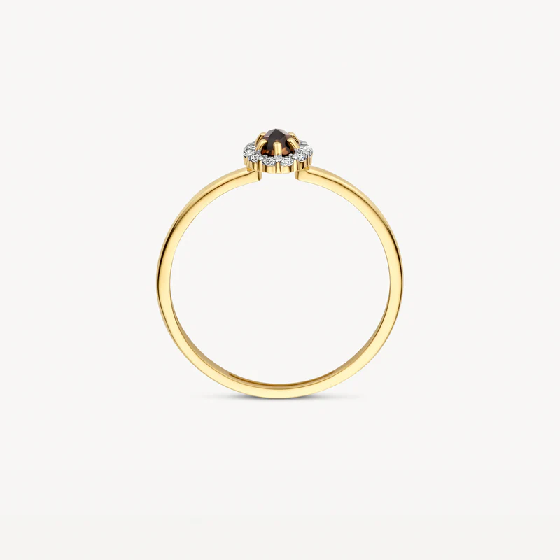 Laat je betoveren door de diepe, aardse tinten van deze elegante 14k geelgouden ring, gezet met een prachtige rookkwarts. De rookkwarts, met zijn natuurlijke kleurvariaties, wordt omlijst door schitterende zirkonia's in een pavé-zetting. De combinatie van de warme rookkwarts en het glanzende goud creëert een tijdloze en stijlvolle uitstraling. De chaton-zetting benadrukt de schoonheid van de edelsteen en geeft de ring een klassieke uitstraling.