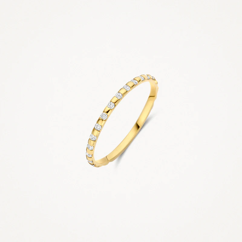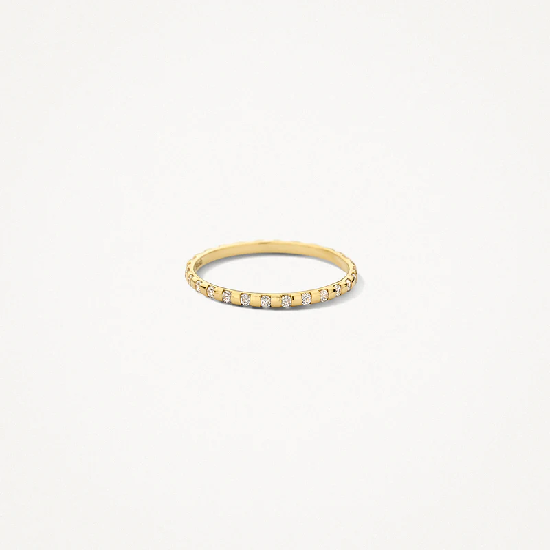 Laat je stijl subtiel stralen met deze elegante Blush ring van 14 karaat geelgoud. De fijne band van 1,3 mm is verfijnd vormgegeven en bezet met sprankelende zirkonia’s in een fantasiezetting. De heldere stenen vangen het licht op een bijzondere manier, waardoor de ring een zachte, luxueuze glans krijgt – perfect om elke dag te dragen of te combineren met andere aanschuifringen uit de Blush collectie.