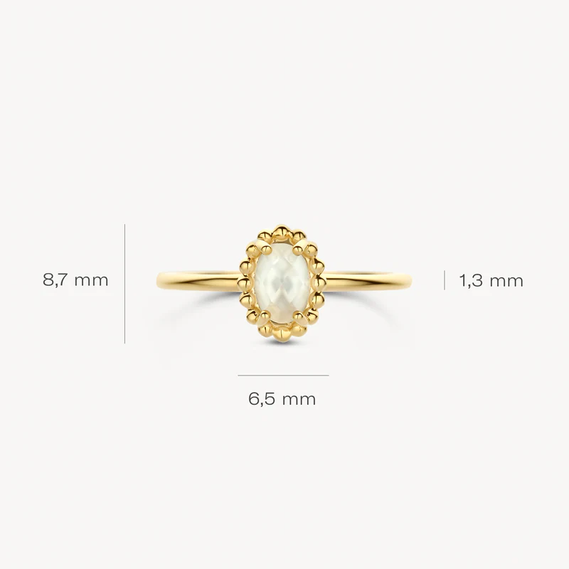 Voeg een verfijnde en speelse touch toe aan je sieradencollectie met deze Blush ring van 14k geelgoud. Het sieraad combineert een wit parelmoer middenstuk met sprankelend bergkristal in een elegante chaton-zetting, omringd door een subtiel bolletjesmotief dat de ring een speelse, maar luxe uitstraling geeft.