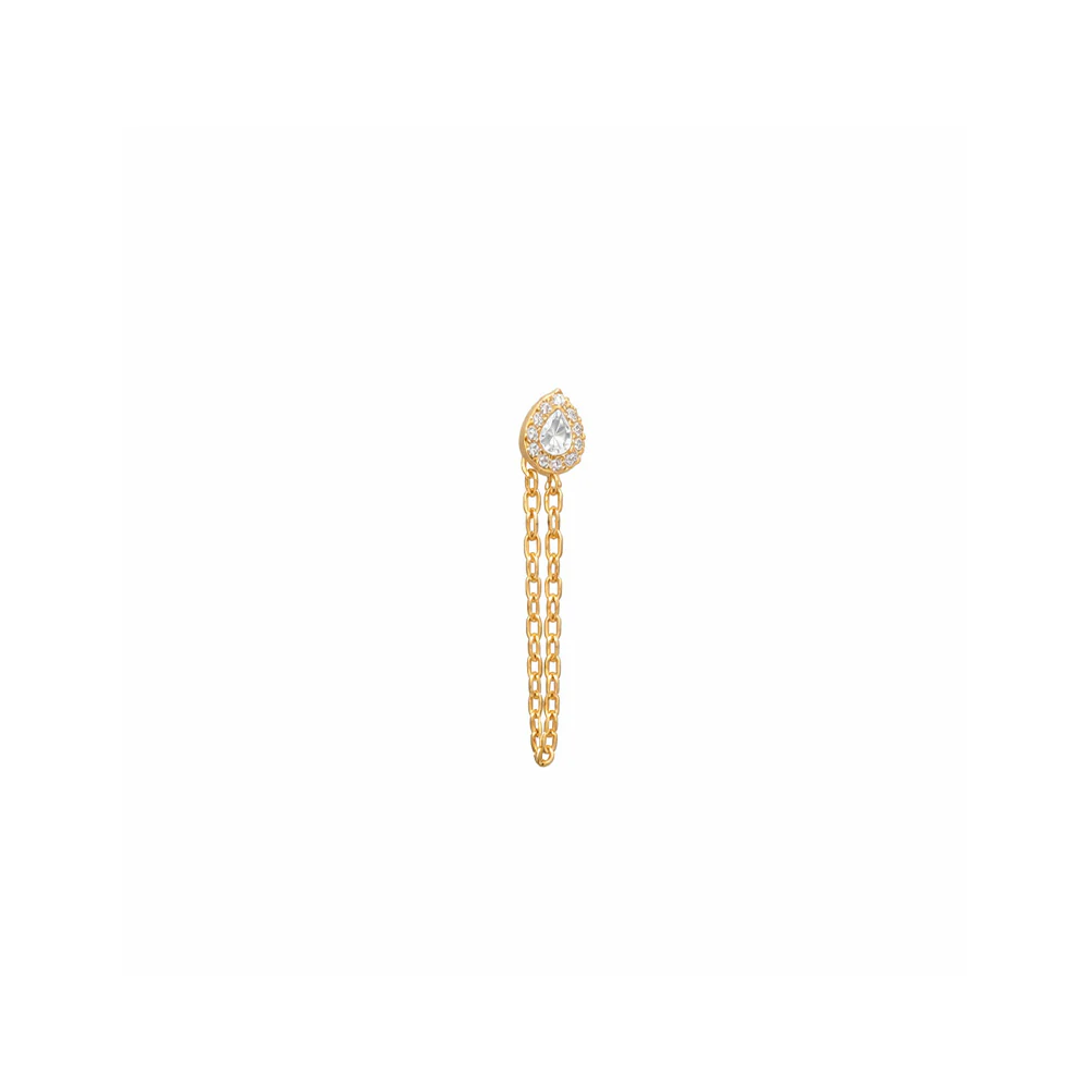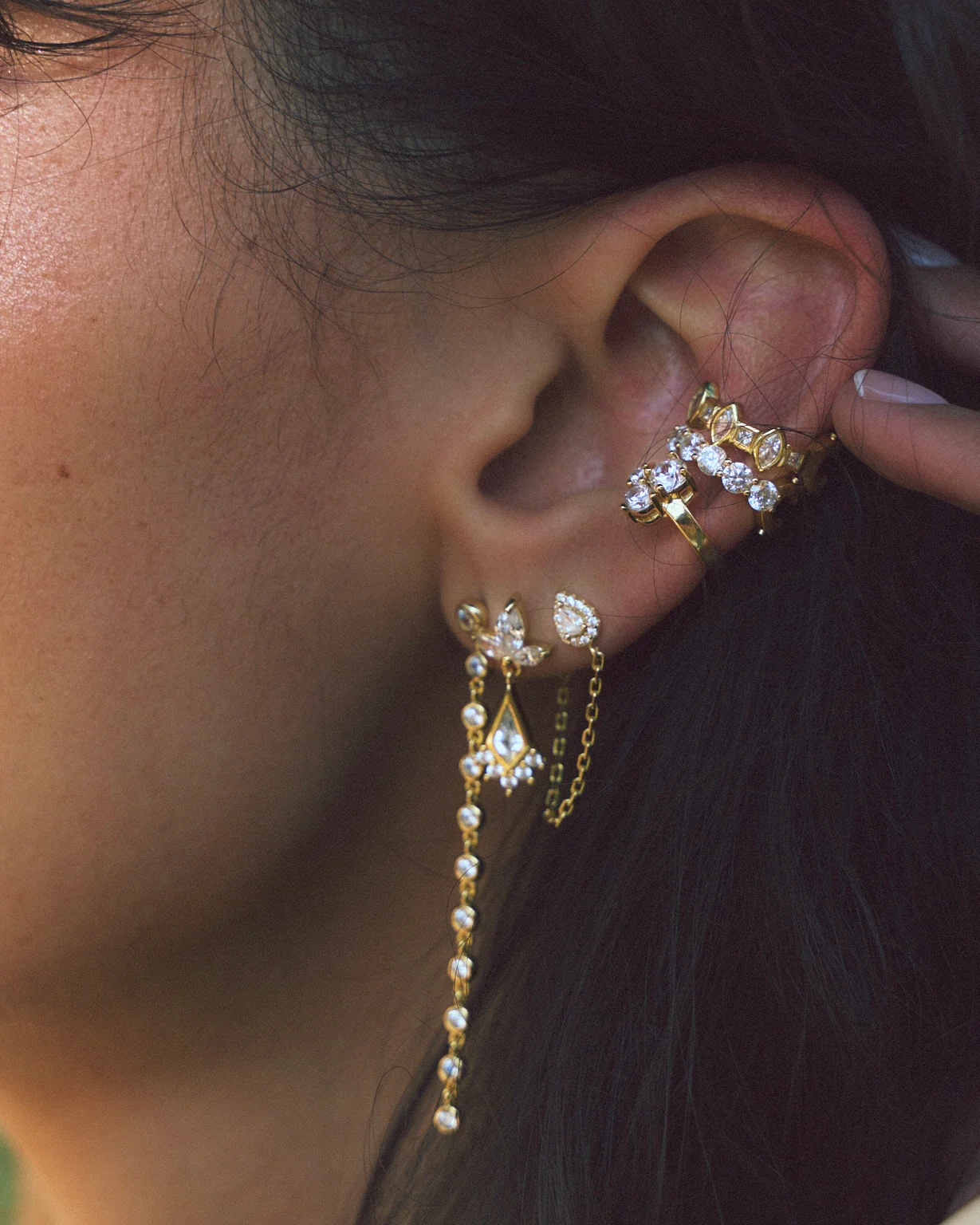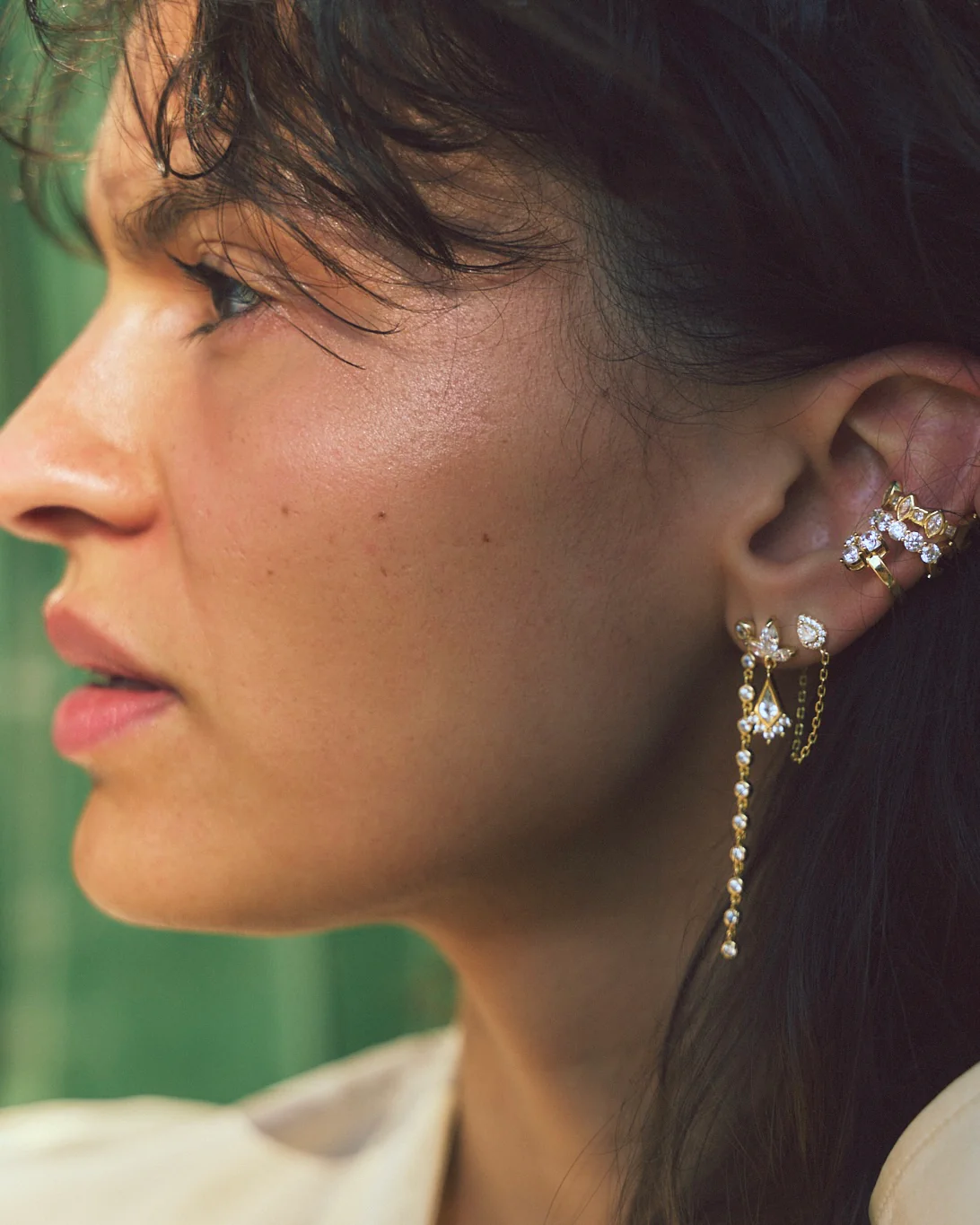 De witte steen vangt het licht op een verfijnde manier, waardoor er een subtiele sparkle ontstaat zonder dat het te opvallend wordt. Juist die balans maakt deze oorbel zo tijdloos. Klein van formaat, maar met een duidelijke aanwezigheid die elke ear stack net wat verfijnder maakt.