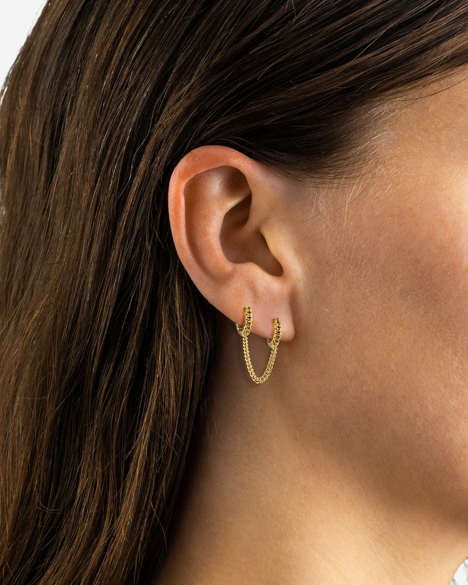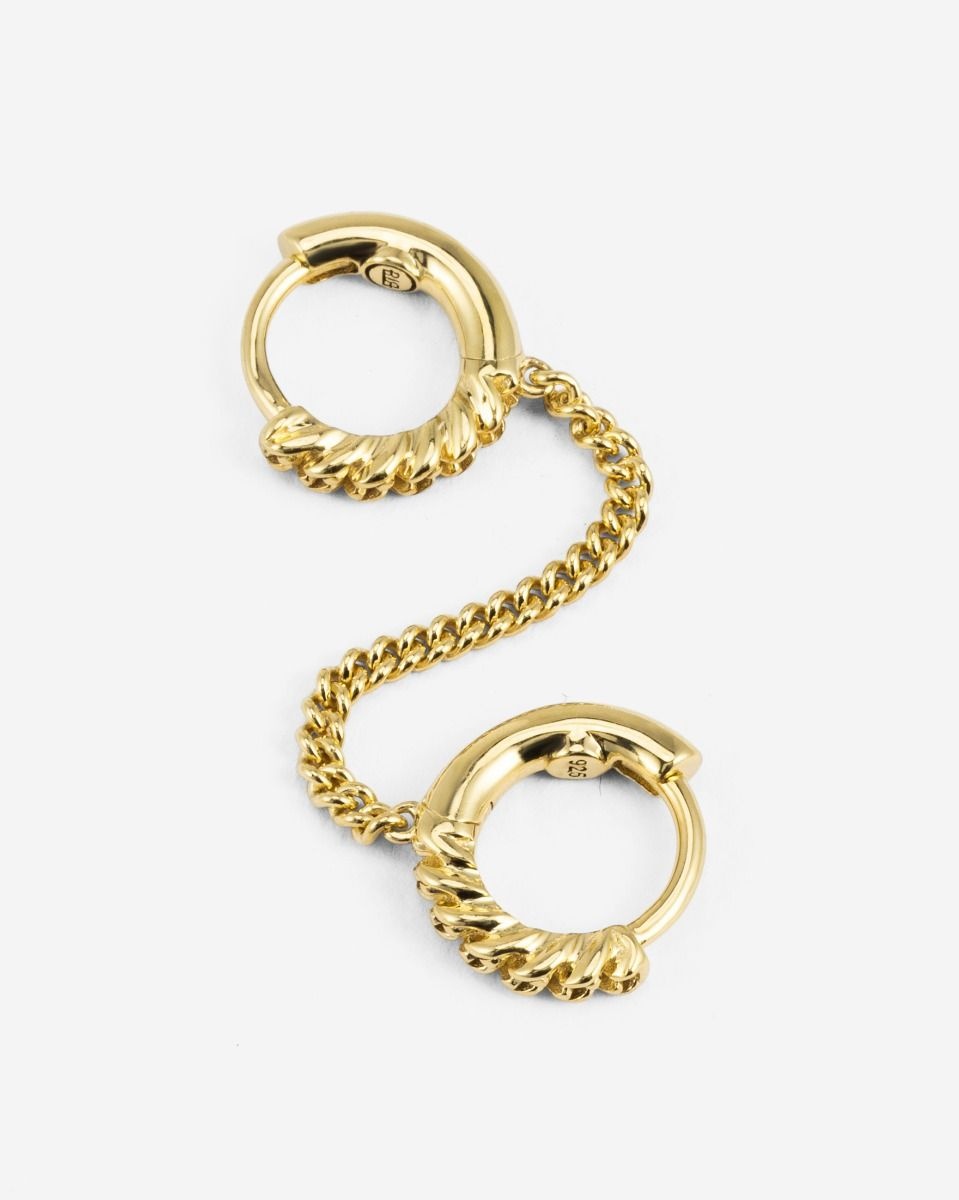 Gemaakt van gerecycled 925 sterling zilver en afgewerkt met een luxe goudkleurige coating van 3,0 micron dik, die gemiddeld vijf keer dikker is dan standaard gold items. De dubbele schakels zorgen voor een speels, doch elegant silhouet dat zowel bij dagelijkse looks als bij speciale gelegenheden past.