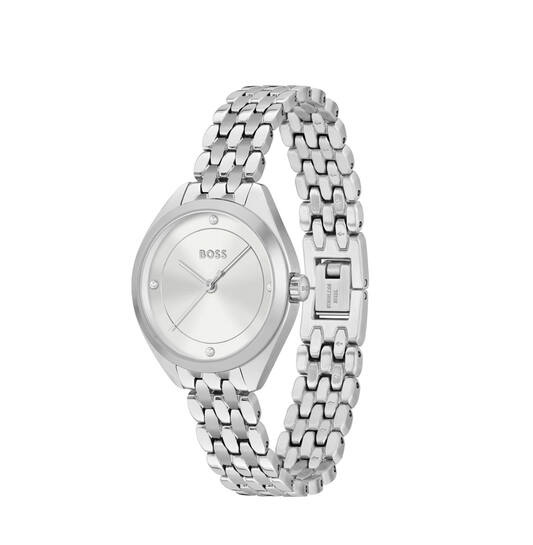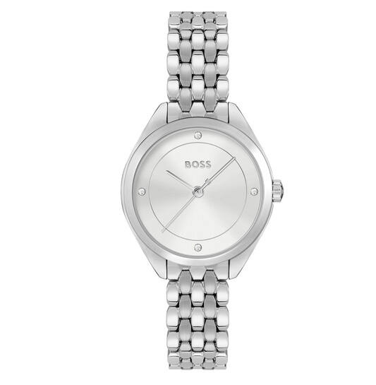 Het Hugo Boss Mae dameshorloge is een toonbeeld van minimalistische elegantie, nu exclusief verkrijgbaar bij Jewelz. Dit horloge combineert een strak, zilverkleurig design met een unieke ovale kast, perfect voor de moderne vrouw die een subtiele, maar stijlvolle accessoire waardeert.