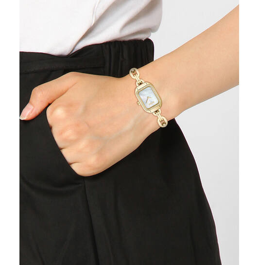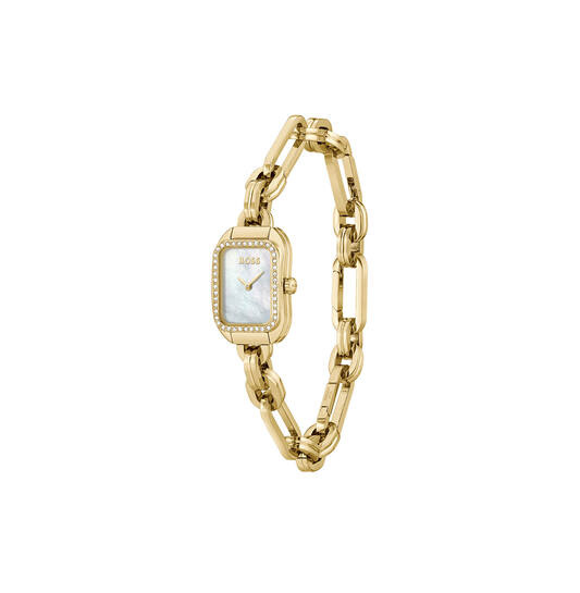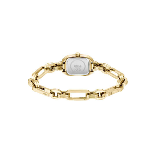 De rechthoekige kast en de fijn bewerkte schakelband zijn vervaardigd uit hoogwaardig roestvrij staal, afgewerkt met een schitterende goudkleurige coating. De zilverkleurige wijzerplaat is minimalistisch en elegant, waardoor de tijd duidelijk af te lezen is. Het mineraalglas beschermt de wijzerplaat tegen krassen en stoten, terwijl de karabijnsluiting zorgt voor een veilige en comfortabele pasvorm.