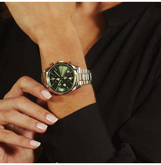 De Grand Tour Ladies horloge valt op door zijn strakke, zilverkleurige roestvrijstalen kast en band. De opvallende groene wijzerplaat voegt een unieke touch toe, terwijl het mineraalglas zorgt voor een heldere en krasbestendige weergave. De vlinder- of vouwsluiting garandeert een veilige en comfortabele pasvorm. Met de handige datumweergave ben je altijd op de hoogte van de dag.