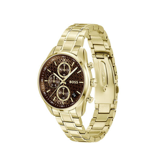 Ontdek de perfecte combinatie van warme elegantie en moderne stijl met de Hugo Boss Grand Tour Ladies dameshorloge, nu exclusief verkrijgbaar bij Jewelz. Dit prachtige horloge, met zijn rijke gouden tinten en unieke bruine wijzerplaat, is de ideale aanvulling op elke verfijnde garderobe.