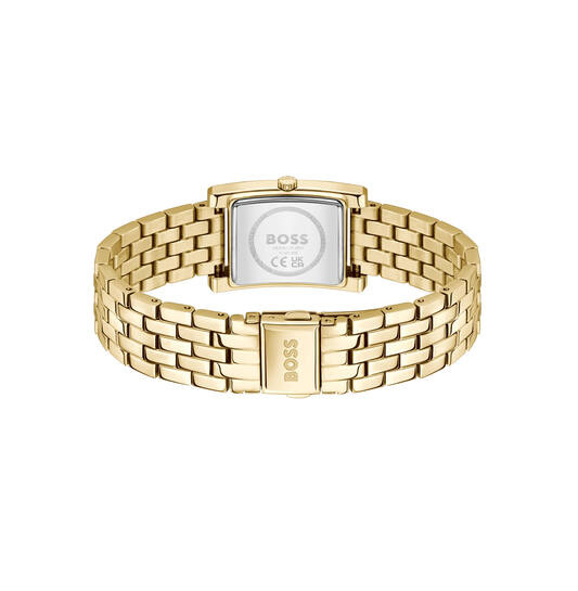 Comfort en veiligheid zijn vanzelfsprekend bij dit Hugo Boss horloge. De goudkleurige stalen horlogeband is uitgerust met een soepele en veilige vlinder- of vouwsluiting. Deze sluiting zorgt niet alleen voor een comfortabele pasvorm om je pols, maar draagt ook bij aan het naadloze en gestroomlijnde design van het horloge. Met een waterdichtheid van 3 ATM (30 meter) is dit horloge spatwaterdicht en geschikt voor dagelijks gebruik, zoals handen wassen of lichte regenbuien. Dit maakt het Hugo Boss LUCY horloge een perfect accessoire voor de vrouw die een verfijnde stijl, luxe uitstraling en betrouwbare functionaliteit combineert in haar dagelijks leven.