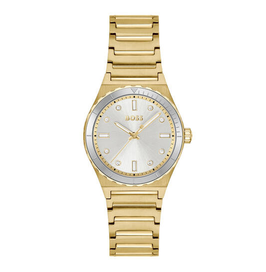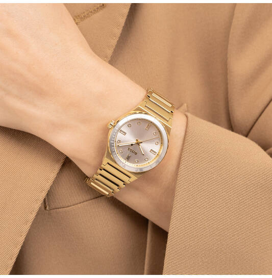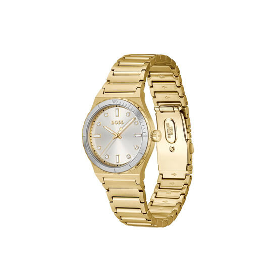 De horlogekast en band zijn vervaardigd uit duurzaam roestvrij staal met een schitterende goudkleurige afwerking. De zilverkleurige wijzerplaat vormt een elegant contrast en zorgt voor een duidelijke afleesbaarheid. Het mineraalglas beschermt de wijzerplaat tegen krassen, terwijl de vlinder- of vouwsluiting zorgt voor een comfortabele en veilige pasvorm.