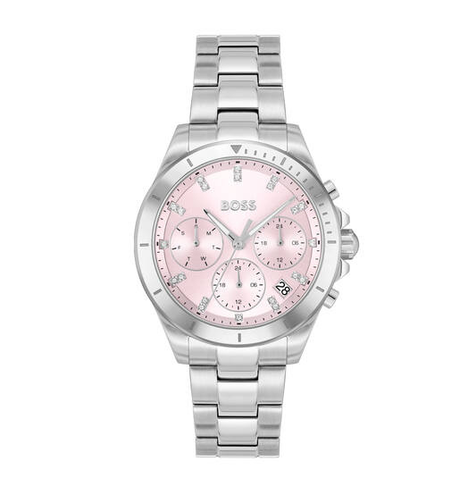 Het Hugo Boss ALLEY model straalt een subtiele luxe uit die moeiteloos past bij elke outfit. De combinatie van zilverkleurig staal en een roze wijzerplaat maakt dit horloge tot een echte blikvanger die elegantie uitstraalt zonder op te vallen.