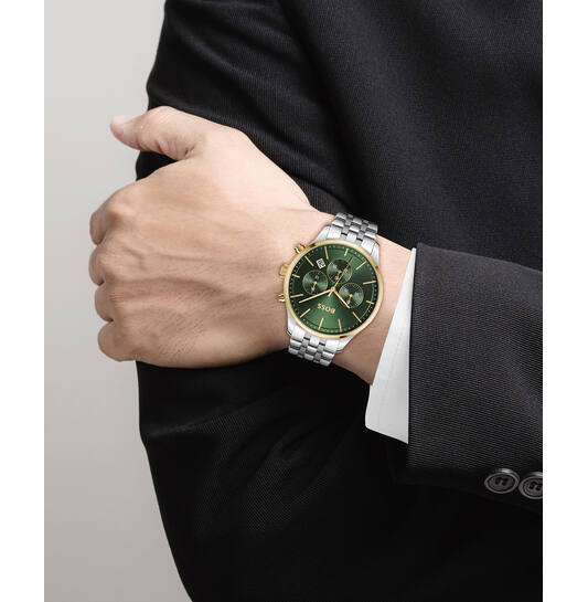 - Opvallende Groene Wijzerplaat: De diepgroene wijzerplaat met datumaanduiding geeft dit horloge een unieke en stijlvolle uitstraling, waardoor het een echte eyecatcher is.