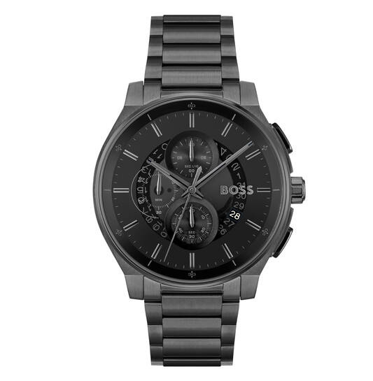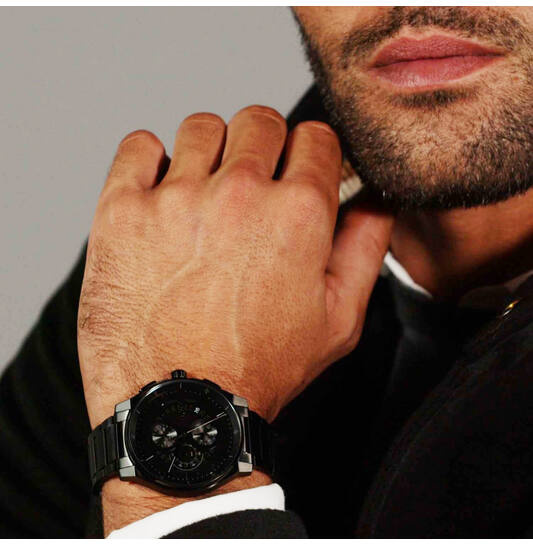 De horlogekast en band zijn vervaardigd uit hoogwaardig roestvrij staal met een diepzwarte afwerking. De zwarte wijzerplaat, met chronograaffuncties, zorgt voor een uniforme en krachtige uitstraling. Het mineraalglas beschermt de wijzerplaat tegen krassen, terwijl de vlinder- of vouwsluiting zorgt voor een veilige en comfortabele pasvorm.