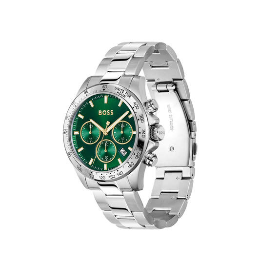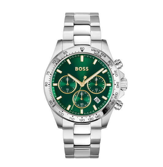 Voor de man die durft op te vallen met subtiele elegantie, presenteren we het indrukwekkende Hugo Boss HERO herenhorloge. Dit robuuste uurwerk, geheel uitgevoerd in glanzend zilverkleurig staal, combineert klassieke kracht met een verrassende, moderne twist. De strakke, zilverkleurige stalen horlogekast in een tijdloze ronde vorm, samen met de robuuste, bijpassende stalen horlogeband, vormt een naadloze en geraffineerde eenheid. Het meest opvallende kenmerk is de levendige groene wijzerplaat, die een krachtig en toch verfijnd contrast vormt met het zilverkleurige staal. Dit maakt het de ideale accessoire om zowel een zakelijke outfit als een casual look naar een hoger niveau te tillen.