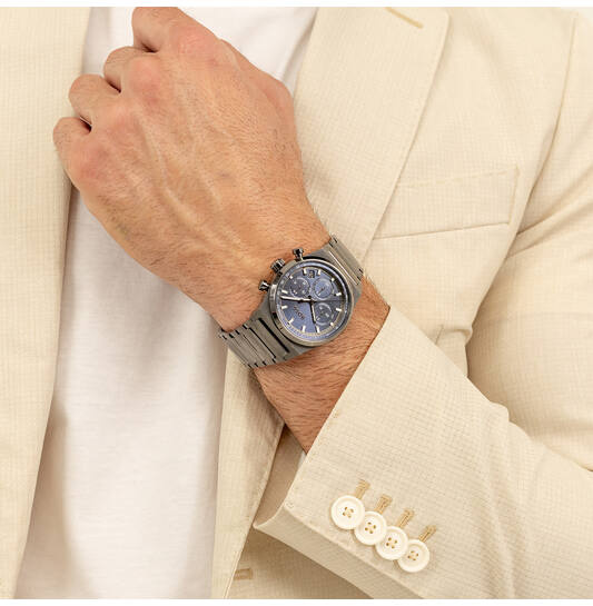 - Diepblauwe Wijzerplaat: De blauwe wijzerplaat met chronograaf en datumaanduiding biedt een stoere en functionele uitstraling.