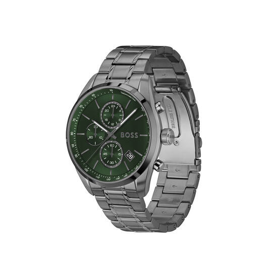 Het Hugo Boss Grand Prix herenhorloge combineert een opvallende groene wijzerplaat met een robuuste zwarte stalen band, nu exclusief verkrijgbaar bij Jewelz. Dit horloge is ontworpen voor de man die een statement wil maken met een unieke en gedurfde stijl.