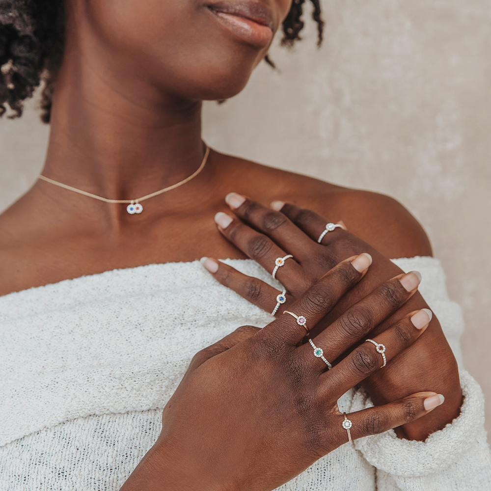 De ringband is volledig bezet met fijne diamanten (totaalgewicht 0.17 ct), waardoor elke beweging een subtiele fonkeling meebrengt. De halo meet 5,5 mm, met een edelsteen van 2,5 mm in het midden – perfect in balans tussen elegantie en aanwezigheid. Dankzij het aanschuifbare design combineer je deze ring moeiteloos met andere favorieten voor een persoonlijke, luxueuze look.