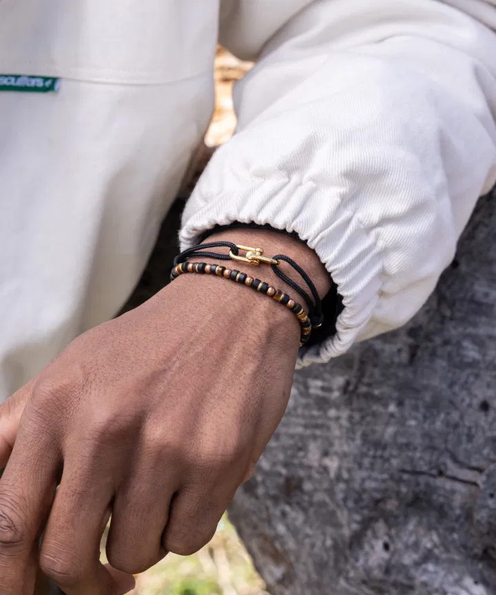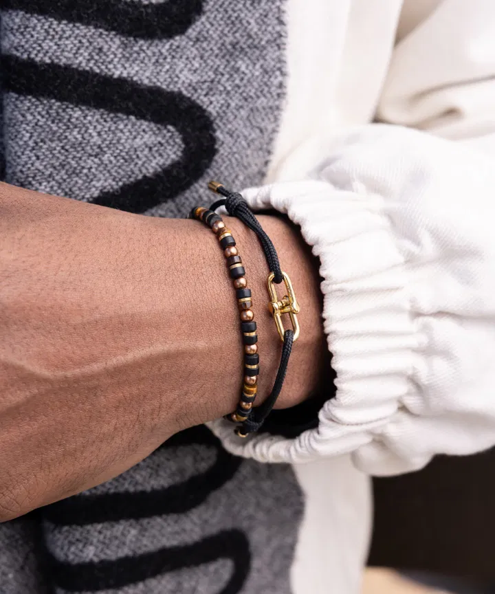 De armband is vervaardigd met een goudkleurige afwerking, die prachtig contrasteert met de zorgvuldig geselecteerde edelstenen. Elke edelsteen heeft zijn eigen betekenis: Shell Pearl staat voor veerkracht, Tiger Eye voor zelfvertrouwen en Black Agate voor stabiliteit. Samen creëren deze stenen een harmonieuze balans die zowel visueel aantrekkelijk is als symbolische kracht biedt.