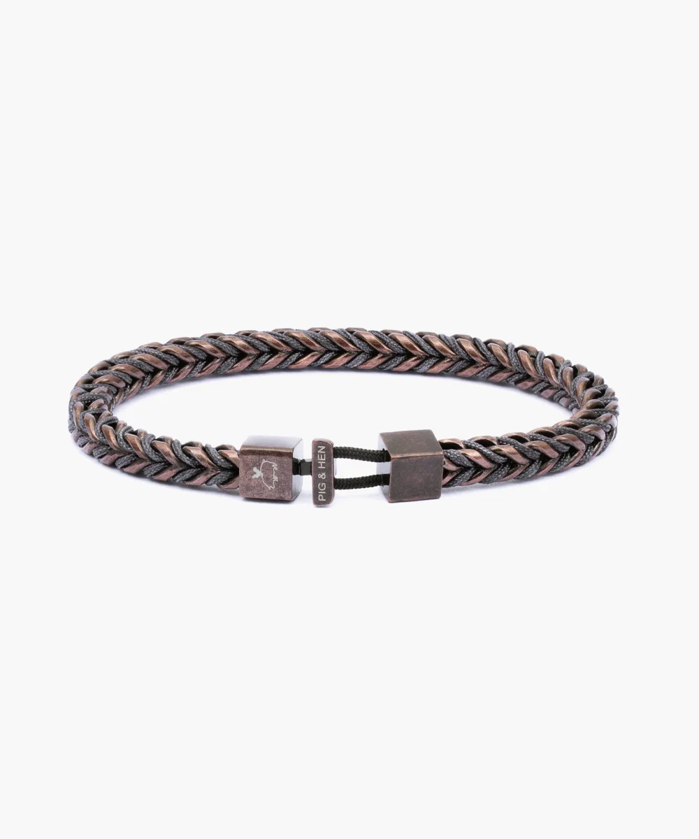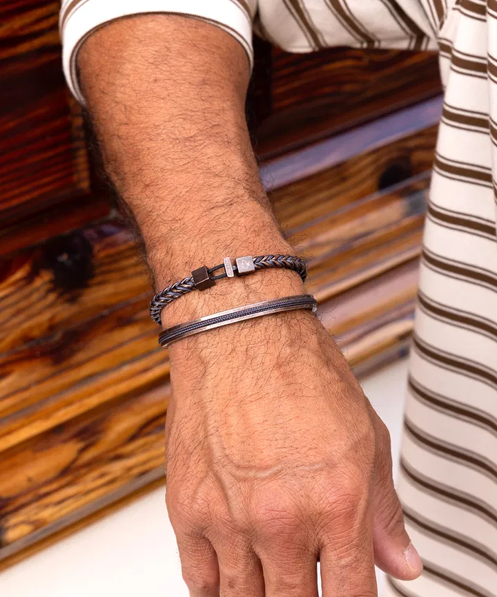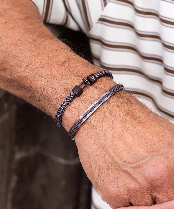 De Catena Foxtail in Slate Gray en goudkleur is een armband die kracht en verfijning moeiteloos combineert. Het naadloze ontwerp met scherpe lijnen straalt veerkracht en zelfverzekerdheid uit, terwijl het gevlochten nautische touw in het iconische foxtail-patroon een uniek, stijlvol accent toevoegt. Deze armband is perfect voor mannen die waarde hechten aan vakmanschap en tijdloze elegantie.