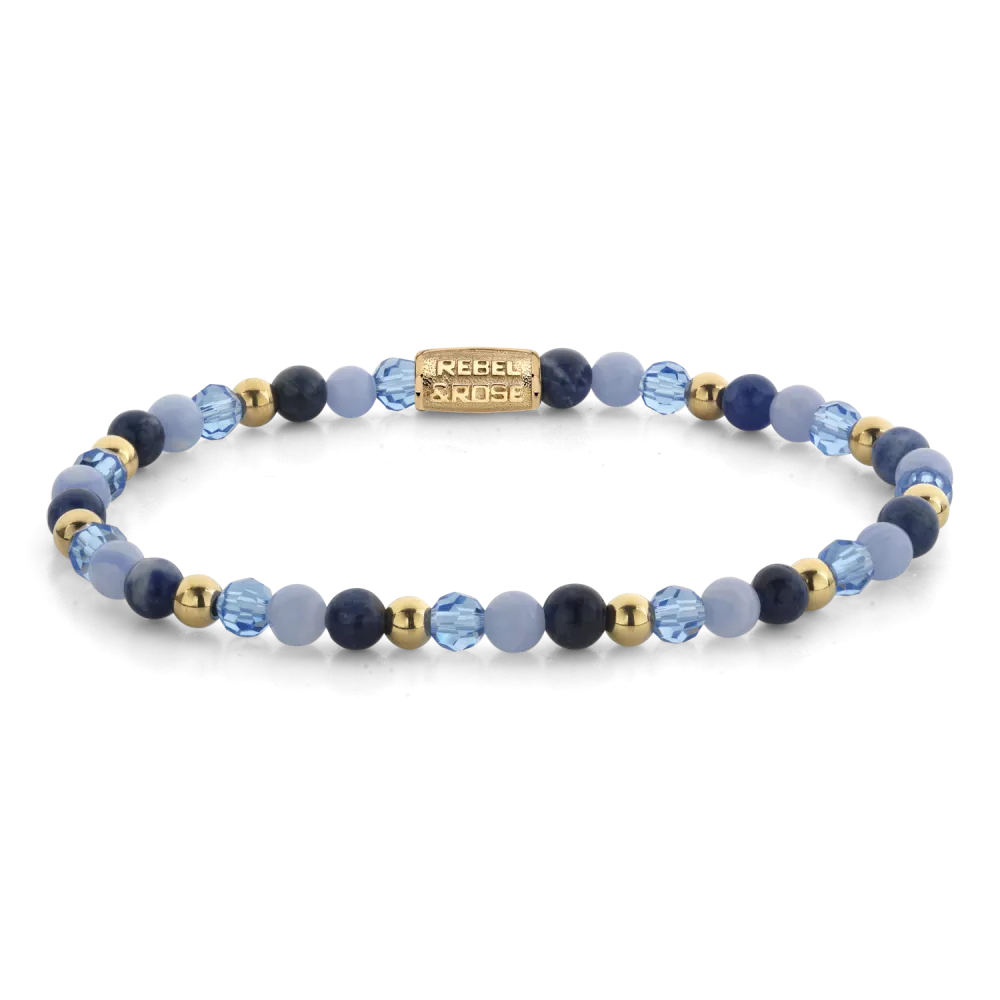 Het mooie van deze Rebel & Rose armband is zijn veelzijdigheid. Draag hem als een enkel, elegant statement, of combineer hem moeiteloos met andere zilverkleurige, leren, of onze diverse collectie kralenarmbanden om een persoonlijke ‘armparty’ te creëren die jouw individuele stijl weerspiegelt. De gepolijste afwerking van de stenen benadrukt hun schittering, en de harmonieuze mix van blauwe en goudkleurige tinten maakt deze armband verrassend breed inzetbaar. Of je nu kiest voor een casual outfit of een meer geklede look, deze armband voegt direct een vleugje kleur en raffinement toe.