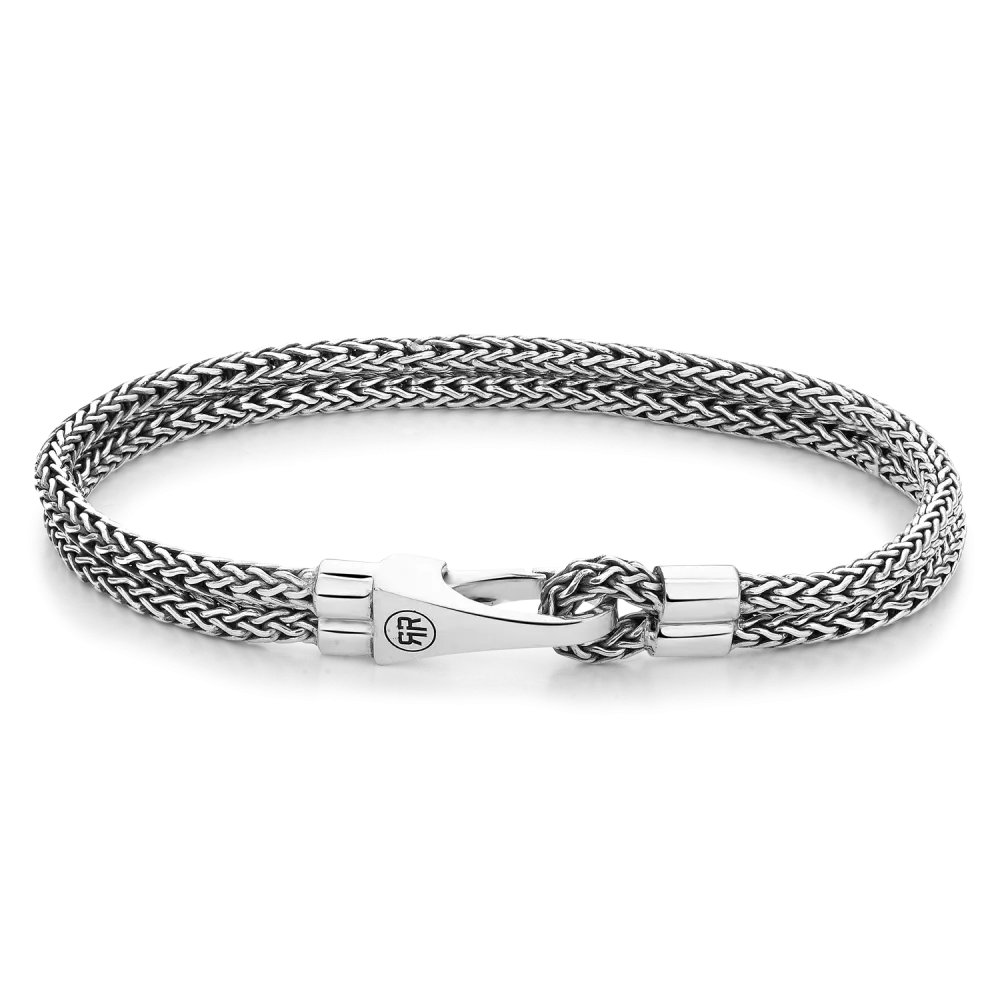 De Double Hooked Six armband van Rebel & Rose is een krachtig sieraad met een verfijnde afwerking. Deze zilverkleurige armband wordt met de hand gevlochten door vakmensen en gemaakt van hoogwaardig 925 sterling zilver. Het dubbele vlechtwerk geeft de armband karakter en diepte, terwijl de herkenbare dubbele haaksluiting zorgt voor een stoere, functionele finishing touch. Met een breedte van 6 mm is dit model slank genoeg voor dagelijks comfort, maar stevig genoeg om op te vallen.