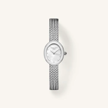 De witte parelmoer wijzerplaat geeft het horloge een luxe en zachte glans die prachtig speelt met het licht. De zilverkleurige horlogeband van roestvrij staal sluit comfortabel om de pols en maakt dit horloge geschikt voor zowel dagelijkse momenten als speciale gelegenheden.
