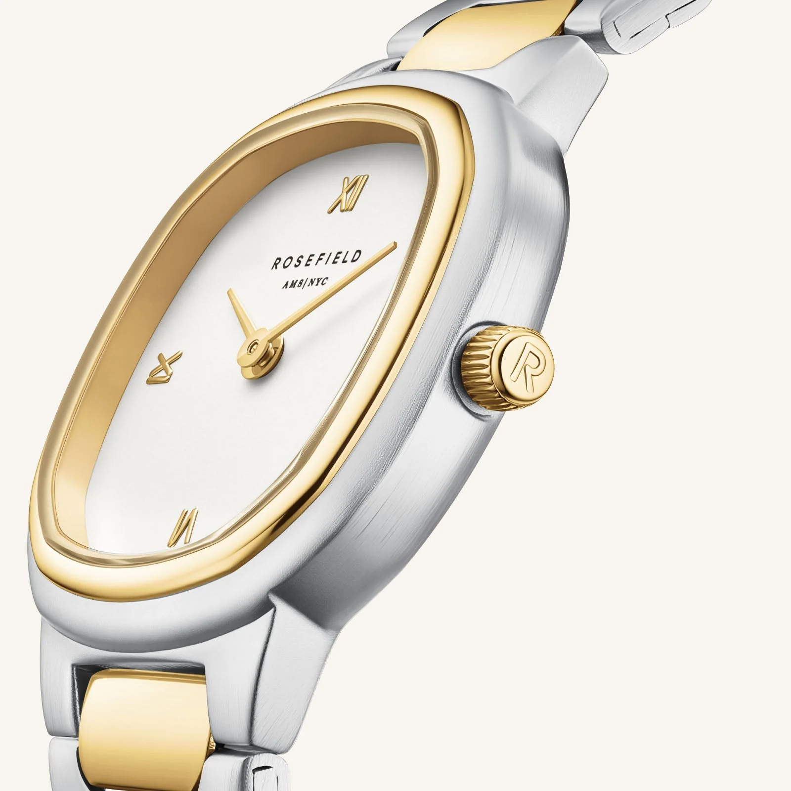 De horlogekast is gemaakt van stevig messing in een goudkleurige en zilverkleurige afwerking. De band van roestvrij staal in dezelfde duotone stijl voelt comfortabel aan en is geschikt voor dagelijks dragen. Bovendien is het materiaal huidvriendelijk en nikkelvrij, waardoor het ook geschikt is voor de gevoelige huid.