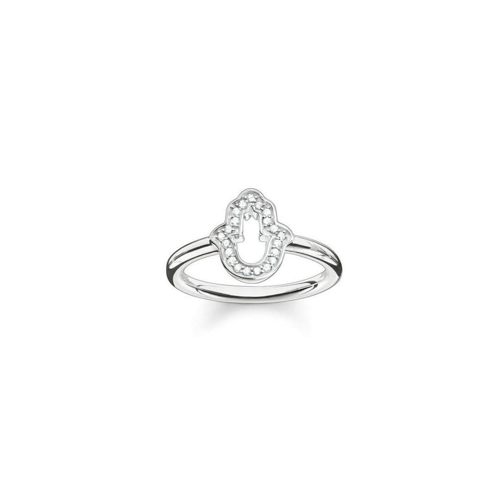 Druk je stijl en individualiteit uit met deze opvallende sterling zilveren ring van THOMAS SABO. Het weelderige Hamsa Hand geïnspireerde motief is bezet met fonkelende Cubic Zirconia, perfect voor het toevoegen van een unieke rand aan elke outfit. Maat van deze ring: 54