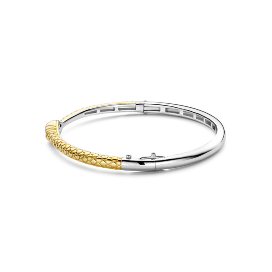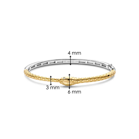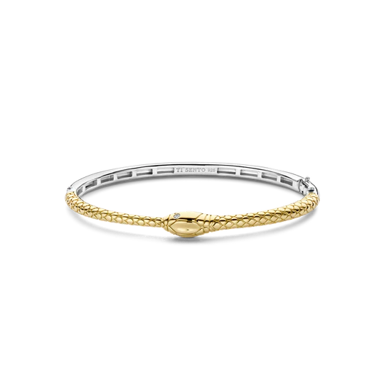 Verleidelijke vintage glam. De TI SENTO Milano zilveren slangenarmband 23058SY is meer dan alleen een sieraad; het is een statement. Geïnspireerd door de tijdloze schoonheid van vintage sieraden, is deze armband een ode aan de verleidelijke slang. Gemaakt van 925 sterling zilver en met glanzend geel, heeft deze armband een intrigerend slangenontwerp. De ogen van de slang, met twee fonkelende cubic zirconia-stenen, stralen een betoverende intensiteit uit.